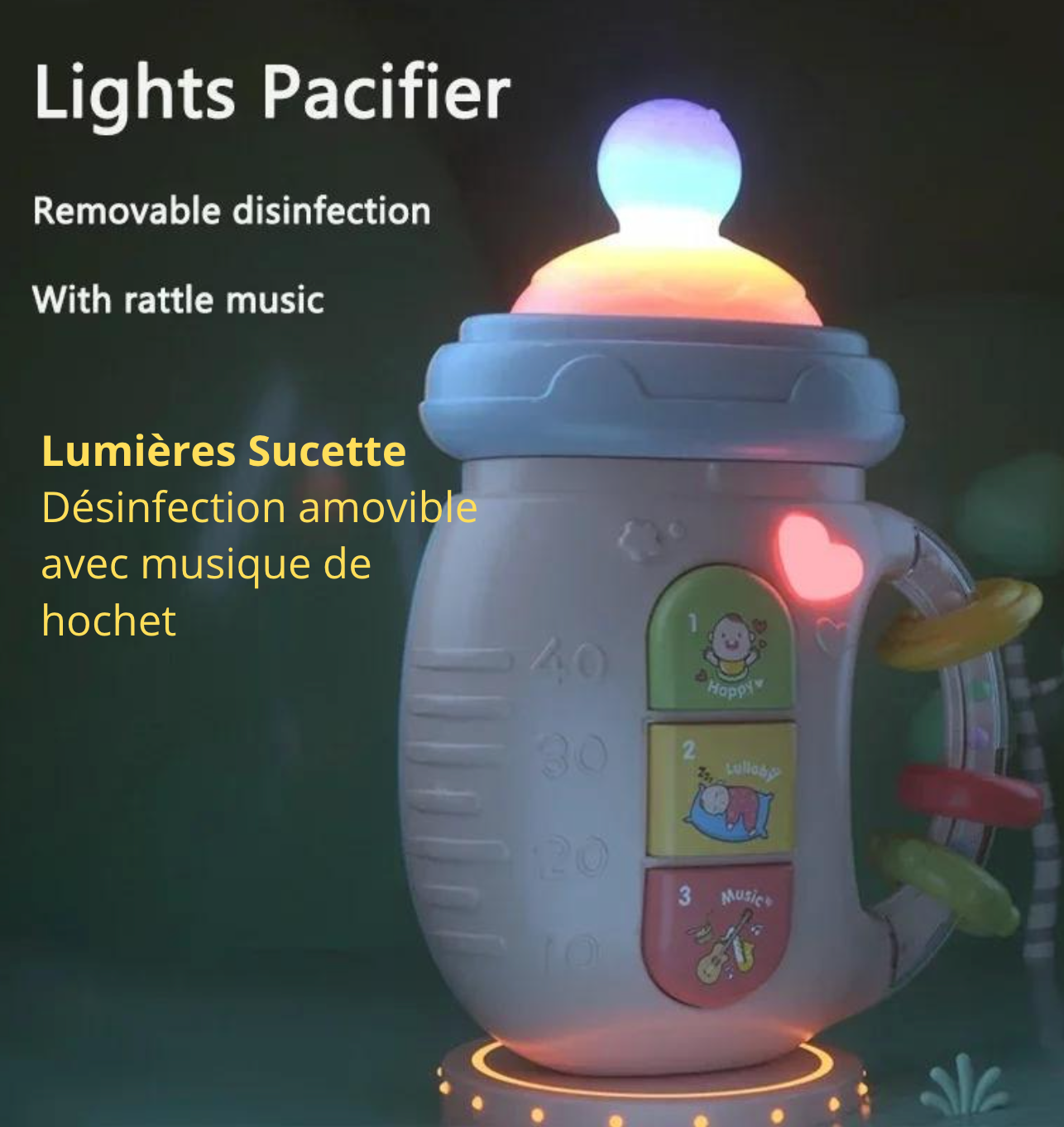 Découvrez notre biberon musical pour bébé de 0 à 12 mois, un accessoire complet pour accompagner votre nouveau-né dans ses premiers mois de vie. Ce biberon unique combine plusieurs essentiels pour le bien-être de votre enfant : une sucette pour éléments nouveau-né, un anneau de dentition souple, des hochets, un jouet éducatif, des hochets mobiles et une musique vocale apaisante.