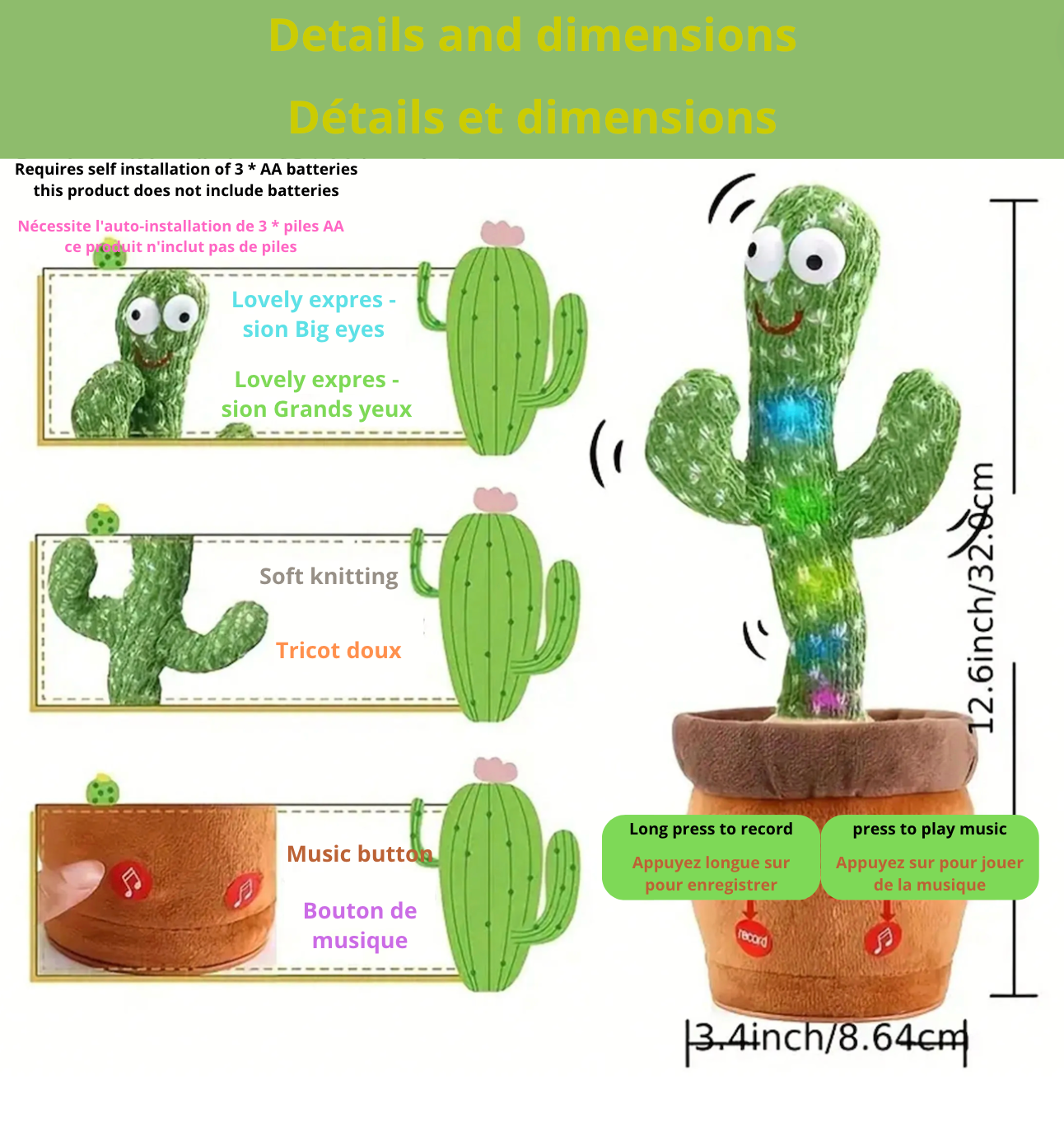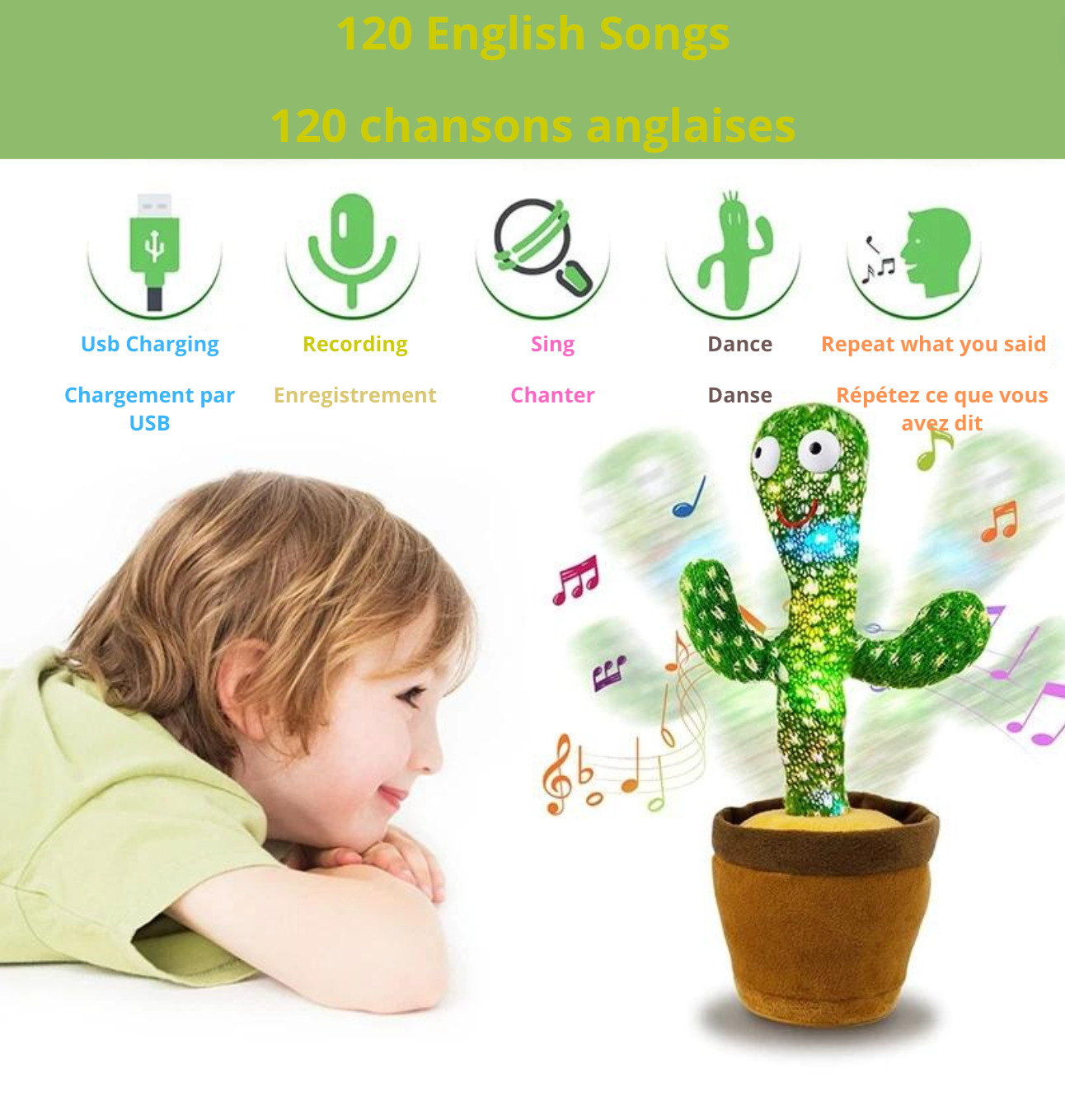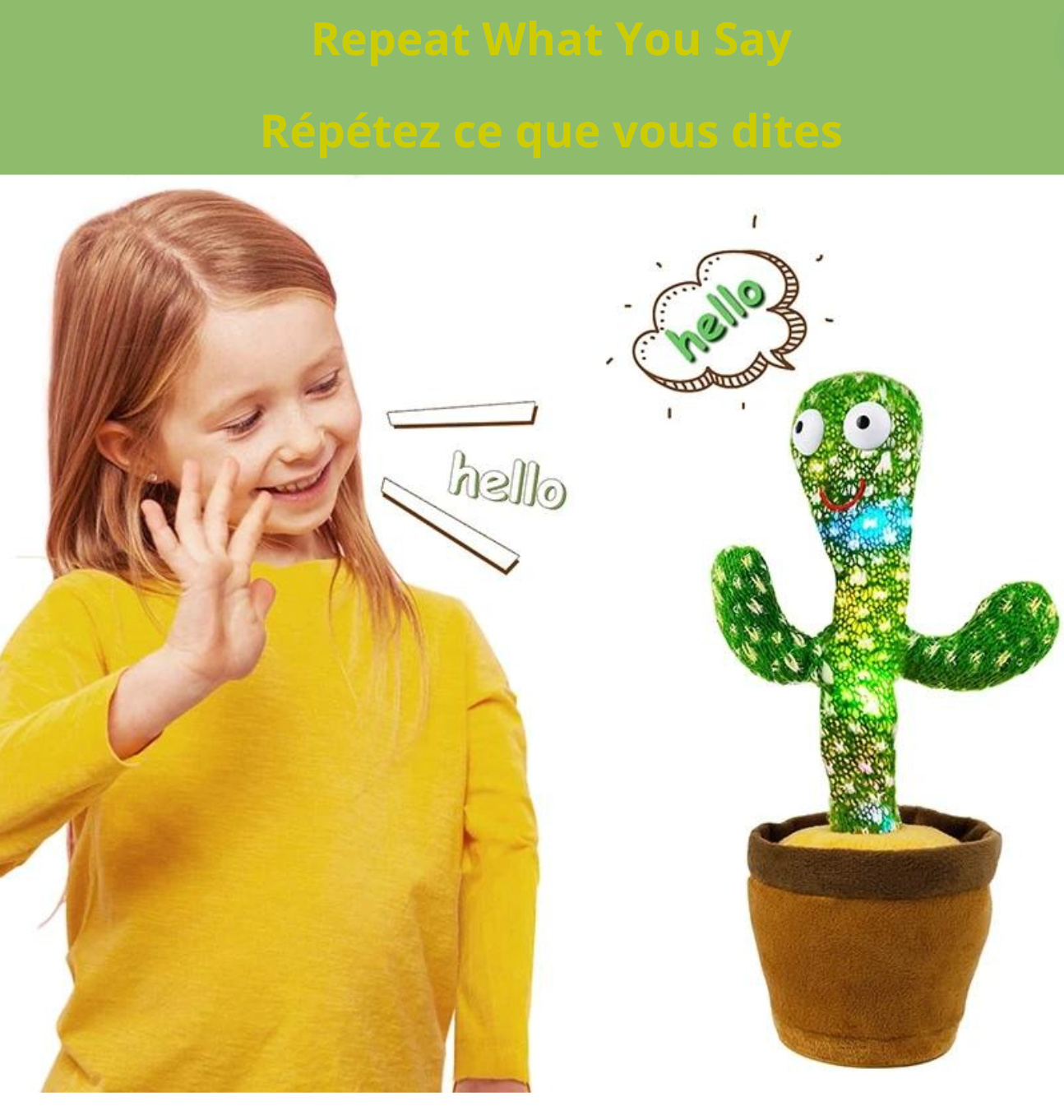 Offrez à vos enfants un jouet unique et interactif qui les divertira et les émerveillera. Le Jouet Cactus parlant et dansant est conçu pour apporter de la joie et de l'émerveillement à chaque moment de jeu.