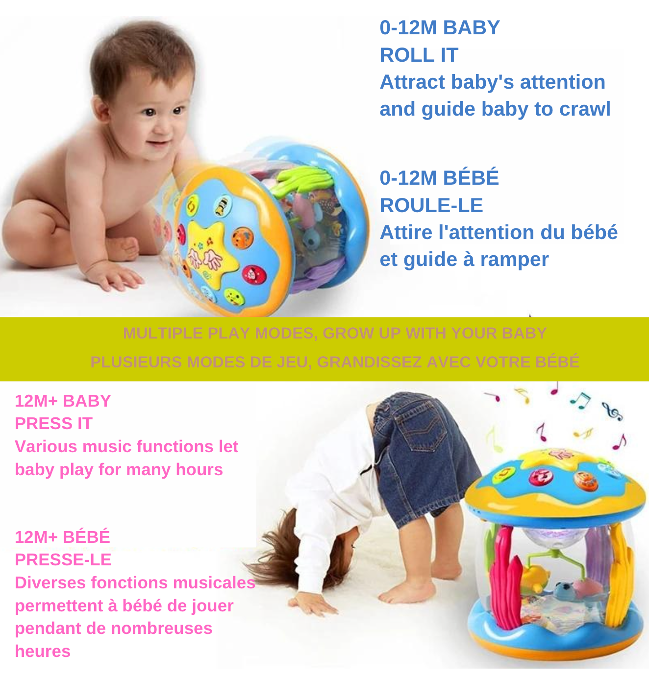 Les lumières colorées et la musique multi-mélodie des jouets sensoriels pour bébés peuvent favoriser leur développement visuel et auditif, aidant ainsi à développer leur cerveau. Stimulez l'imagination illimitée de votre bébé avec ce jouet enchanteur !