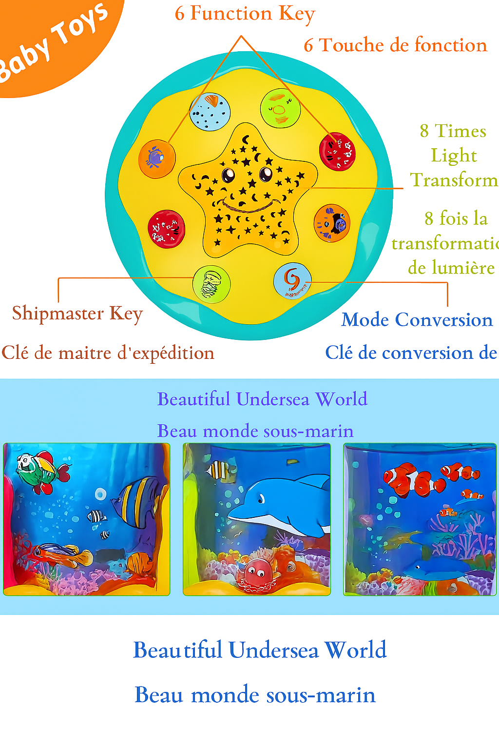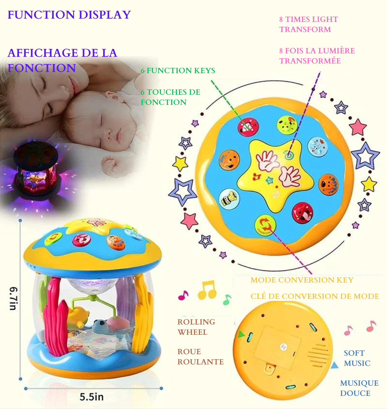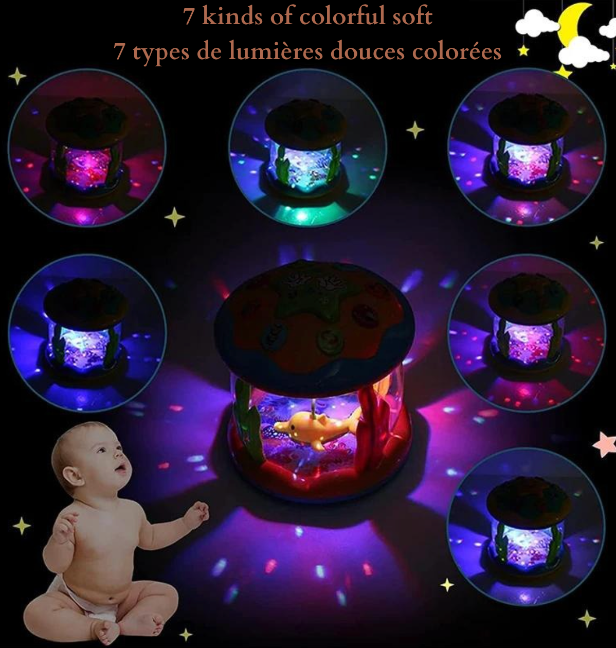 Découvrez notre aquarium jouet avec projecteur rotatif étoiles et lunes, mettant en scène des dauphins et des tortues qui peuvent tourner à 360 degrés. Ces jouets musicaux Montessori offrent une expérience sensorielle éducative précoce pour les tout-petits. Parfait comme cadeau, cet aquarium magique crée une atmosphère de monde océanique de conte de fées grâce à ses magnifiques lumières et sa douce musique.