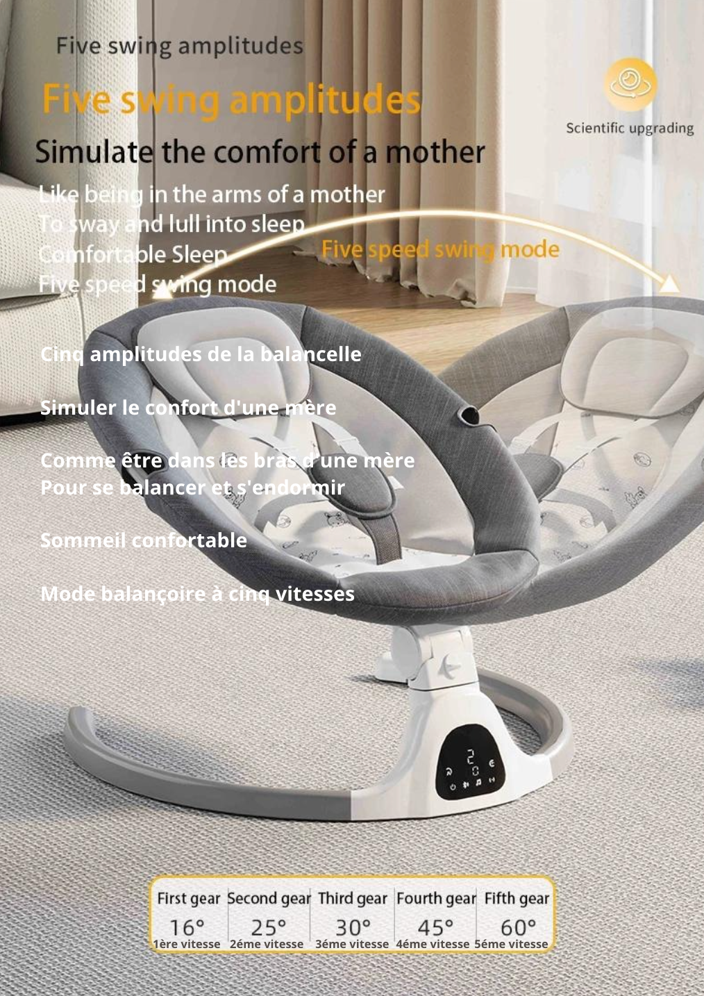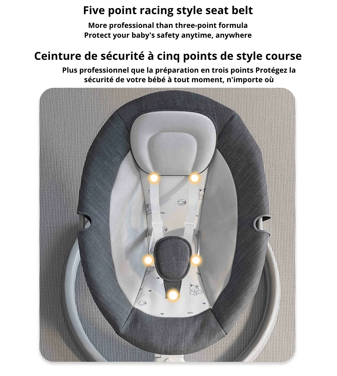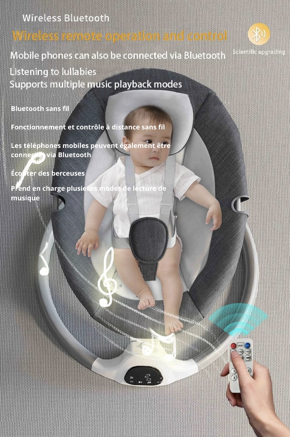 Découvrez la balancelle Minu, alliant un design luxueux à une praticité inégalée, elle deviendra le compagnon idéal de votre bébé de 0 à 36 mois. Confortable et sécurisée, cette chaise à bascule électrique pour nouveau-né est munie d'une ceinture de sécurité à 5 points pour assurer le bien-être de votre tout-petit. De plus, vous pouvez la contrôler à distance depuis votre téléphone via Bluetooth. Offrez à votre bébé des moments de repos paisibles et douillets grâce à notre balancelle Minu.
