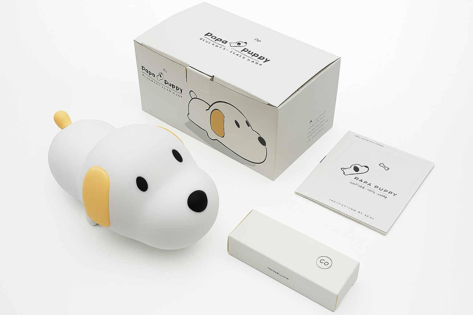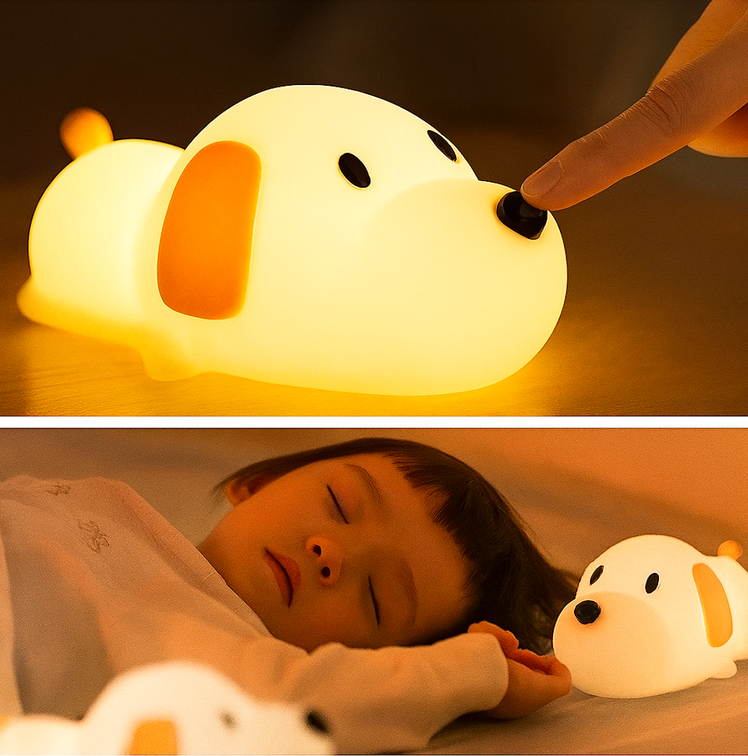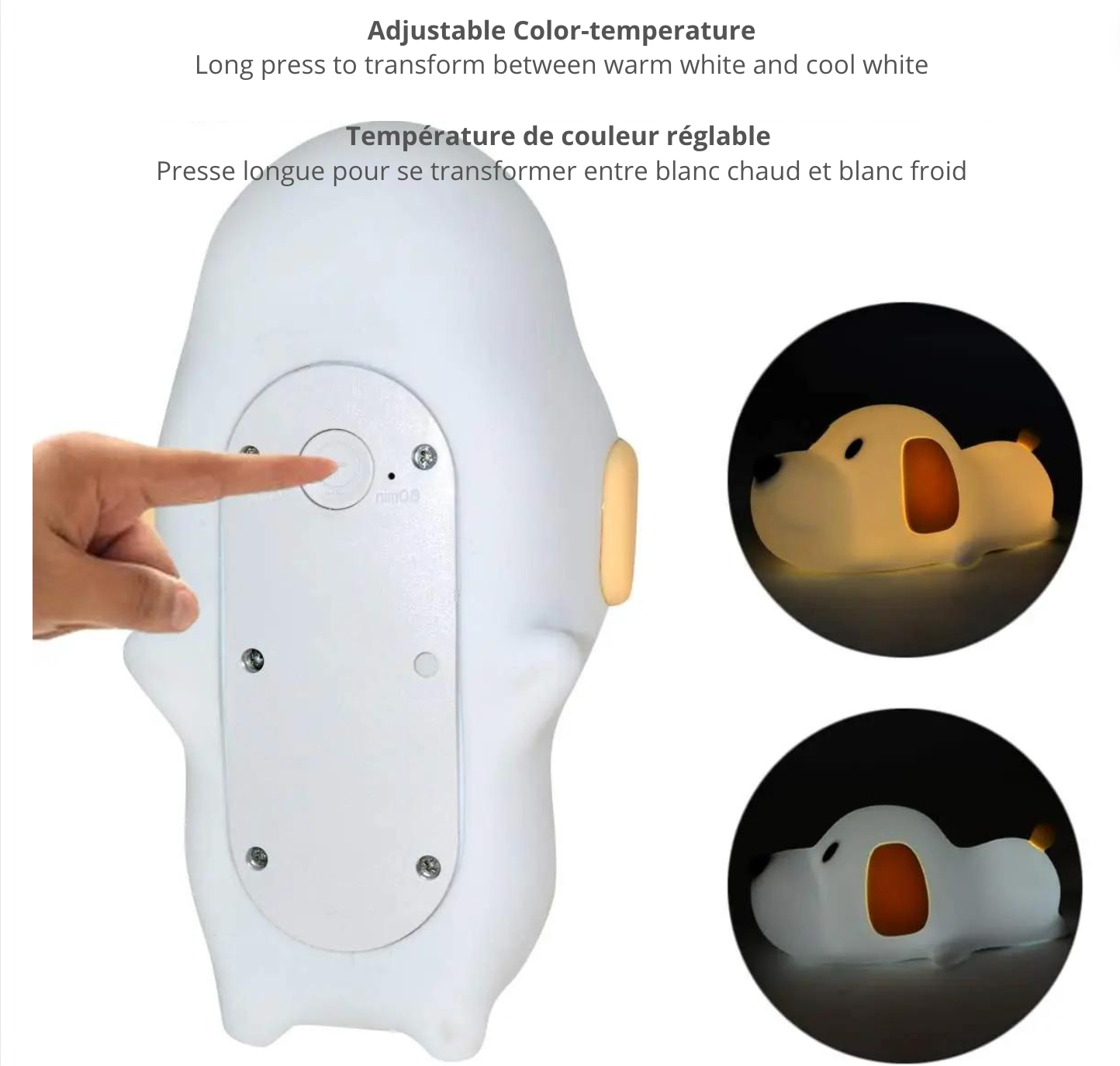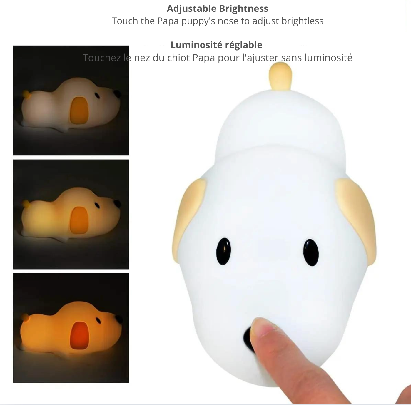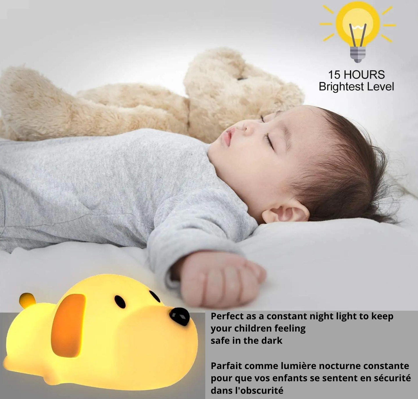 Découvrez notre veilleuse LED en silicone souple et durable en forme de chiot. Avec son capteur tactile, elle crée une atmosphère relaxante pour aider les enfants à s'endormir plus facilement. Stimulant l'imagination des tout-petits, cette veilleuse magique les transporte dans un univers féérique avant de rejoindre le pays des rêves.